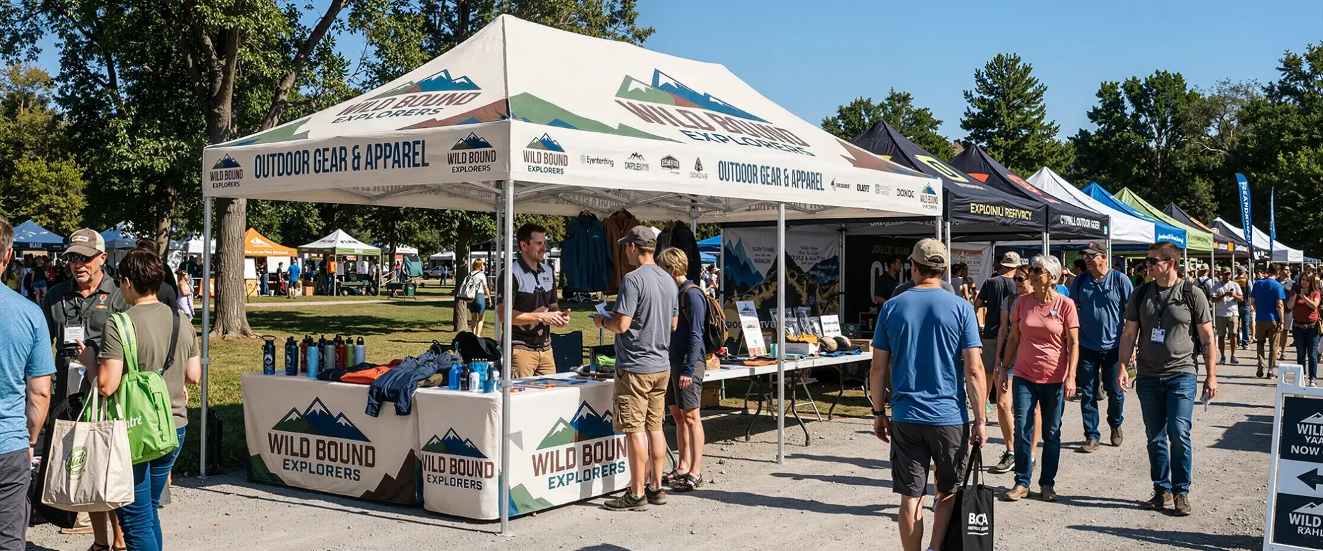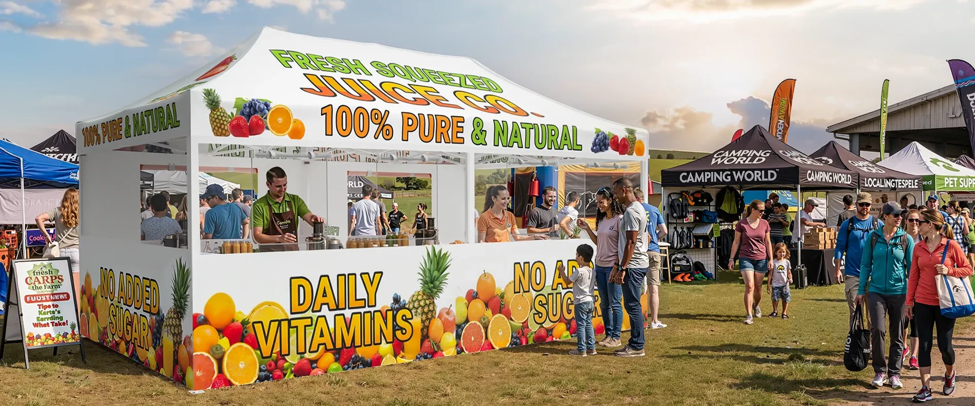 A custom printed 10x20 canopy tent offers a large surface area for graphics and branding.