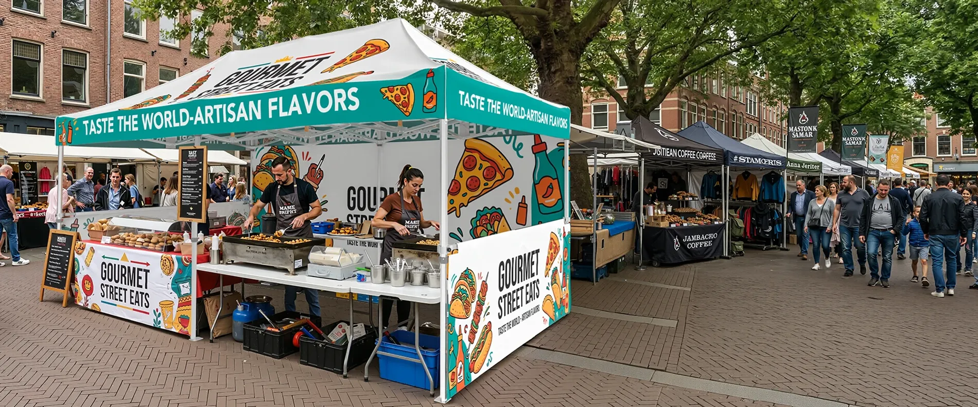When you operate a high-volume food booth, space directly impacts revenue. A 10x20 custom canopy tent provdes 200 square feet or covered area, allowing your to separate cooking, prep, serving, and storage zones, efficiently. During busy festivals or night markets, this layout keeps lines moving and staff organized. For serious food vendors. For serious food vendors, a 10x20 canopy isn't a luxury — it's operational necessity.