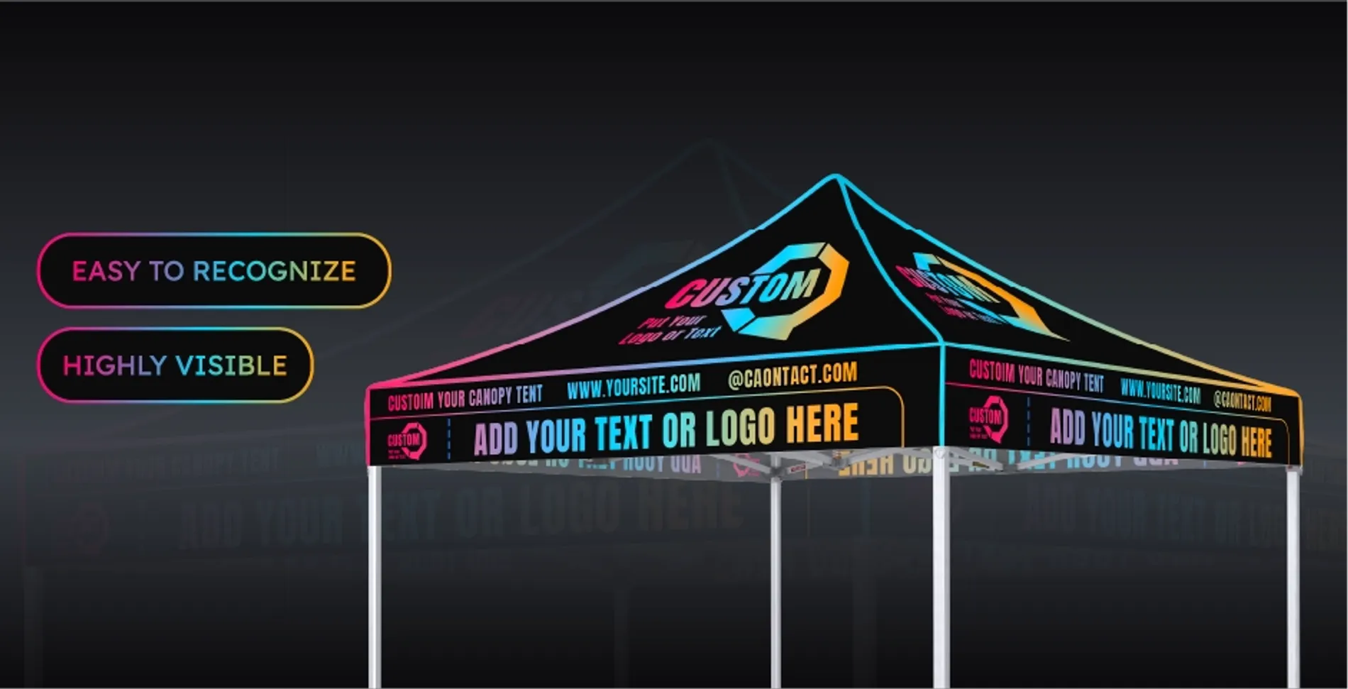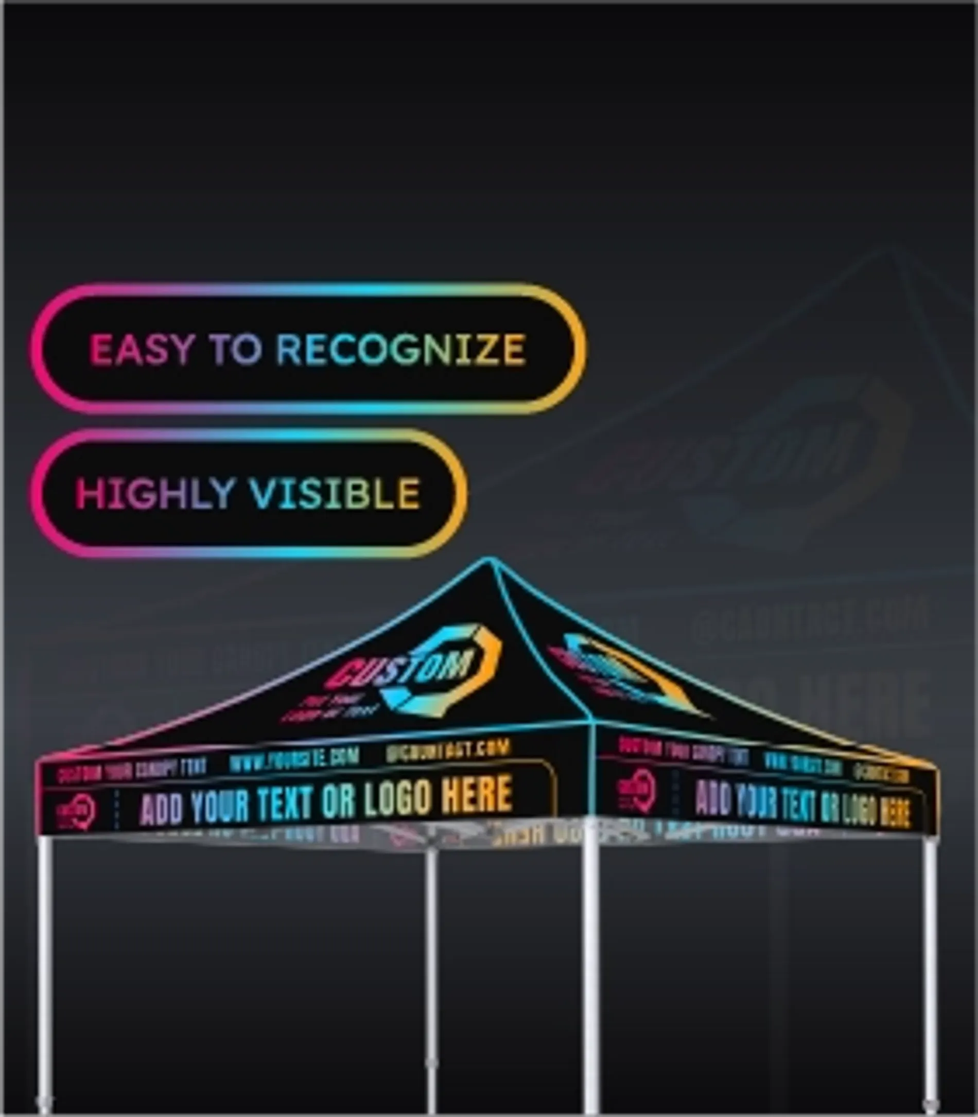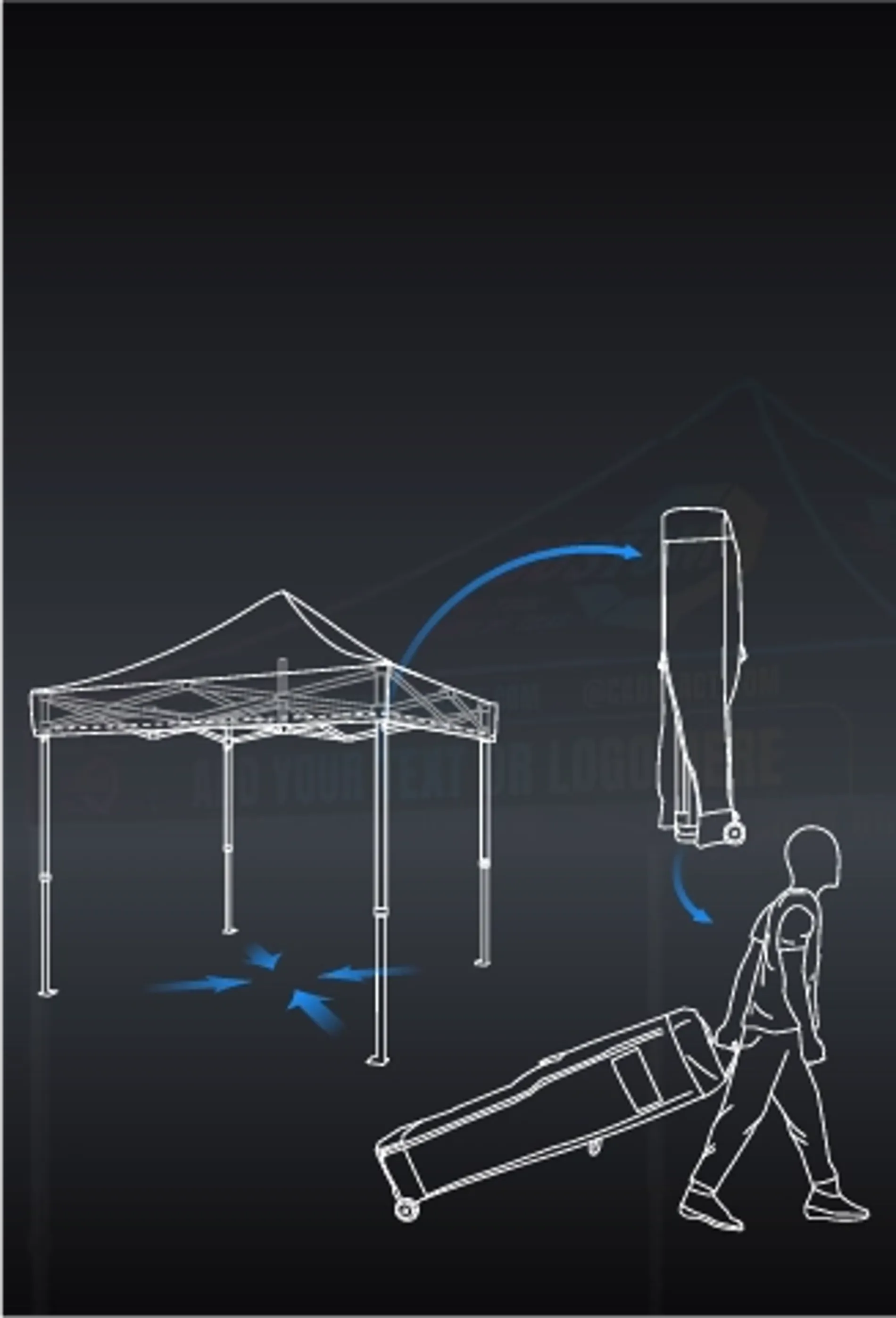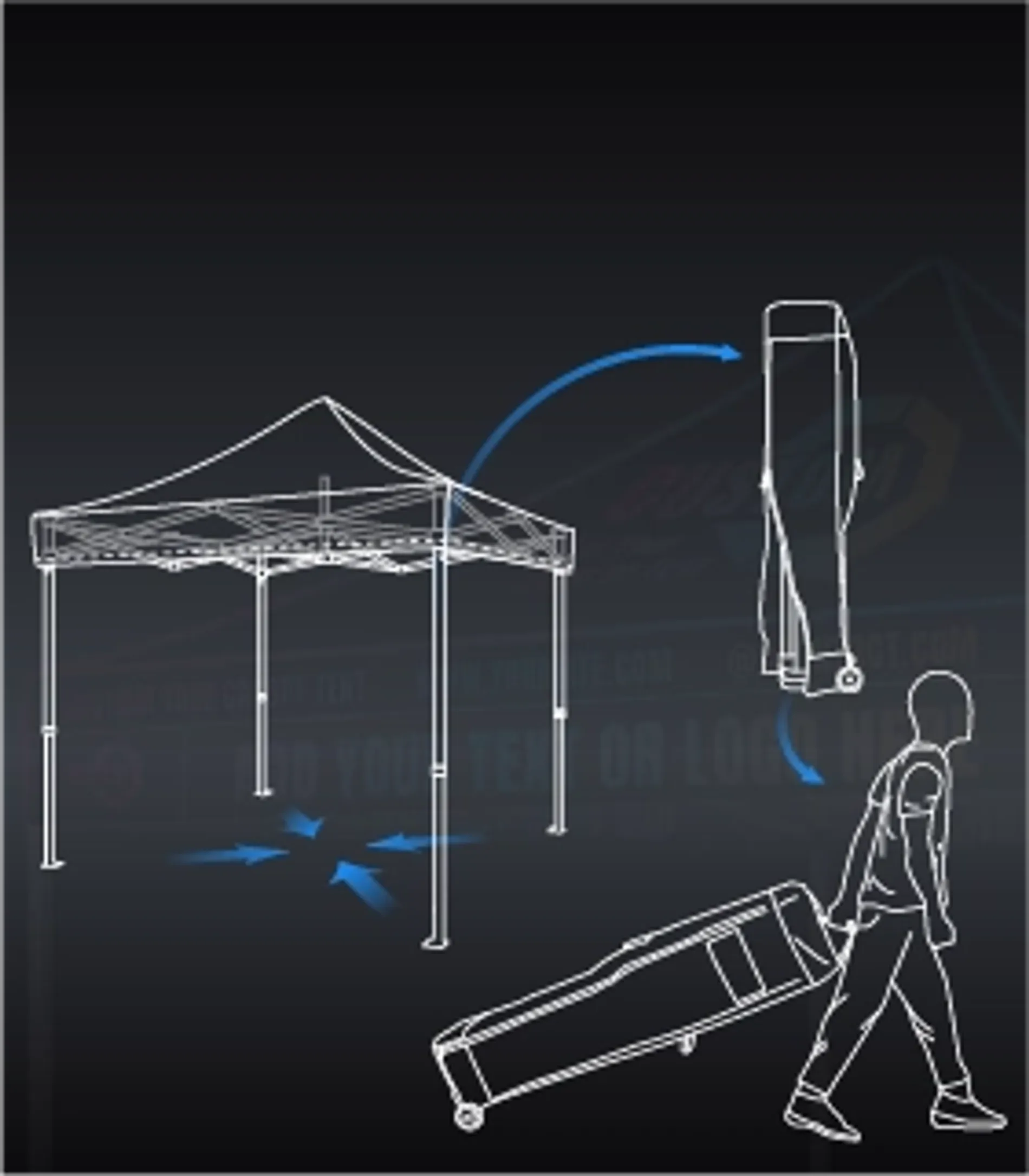 - What I need to consider before buying a custom logo canopy?Here are a few things to consider when you're thinking about buying a custom canopy tent with logo:Frame material: Custom pop up tents are usually offered with both steel and aluminium frame options. Steel frames are heavier and aluminium frames are lighter. The choice needs to be made based on frequency of use and transport needsPrint method: Consider the printing method of the custom tent canopy, as different printing methods bring different colour vibrancy and colour fastness. For the best colour vividness, choose dye sublimation; for a balance between colour vividness and colour fastness, choose digital printing.Size: Before buying a custom outdoor canopy, you need to determine the size of the event venue, the size of the product, and then decide on the size of the tent you need to buy based on these bases.