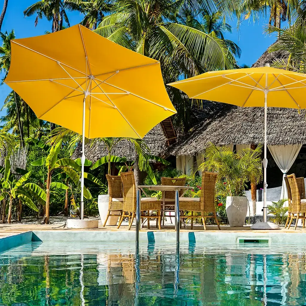 All of our patio umbrellas are designed to offer the ideal coverage and protection needed for all your events. Built to last, thick heavy duty square shaped aluminum ribs. Combined with stainless steel rivet joints, it gives you a virtually indestructible outdoor space. The unrivaled sturdy frame allows the Santorini Umbrella to withstand strong winds of up to 45mph.
